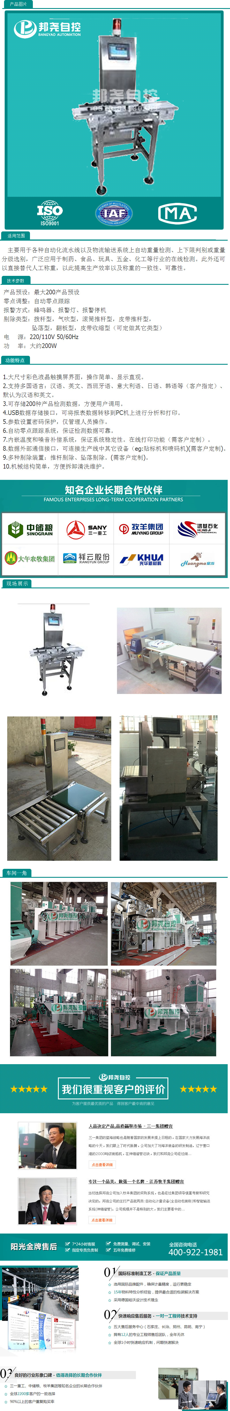 重量選別機(jī)又叫重量分選機(jī),在線(xiàn)檢重秤,是一種應(yīng)用于各種自動(dòng)化流水線(xiàn)以及物流輸送系統(tǒng)上的自動(dòng)重量檢測(cè)、上下限判別或根據(jù)重量檢測(cè)產(chǎn)品是否合格的高科技自動(dòng)化分選設(shè)備。廣泛應(yīng)用于制藥、食品、玩具、五金、化工、汽車(chē)配件等行業(yè)的在線(xiàn)檢測(cè)。此外,還可直接替代人工稱(chēng)重,以達(dá)到提高生產(chǎn)效率,提高準(zhǔn)確度和山少人工,降低成本的目的。